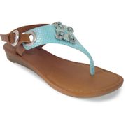 The Amanda Turquoise is a t-strap that features a cross shaped color coordinating signature snap. • 1" heel • Faux snakeskin upper • Leather-like PU footbed • Non skid gum sole
